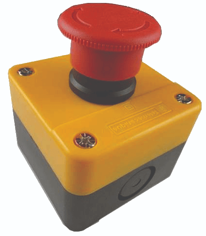 Bouton poussoir d’arrêt d’urgence en abs, intérieur ou extérieur, IP65, 230V 5A. Déverrouillage en tournant la tête.