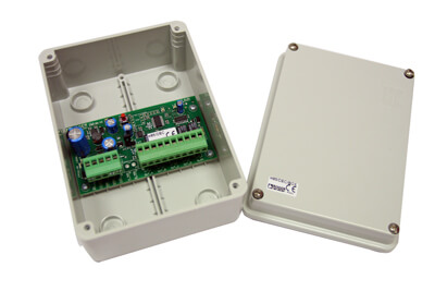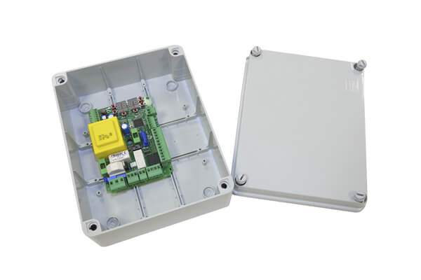 Centrale de commande universelle pour la commande d’un moteur asynchrone 230V AC 50/60Hz, avec ralentissement, en conteneur plastique, pour portail coulissant.