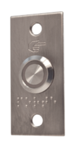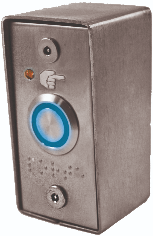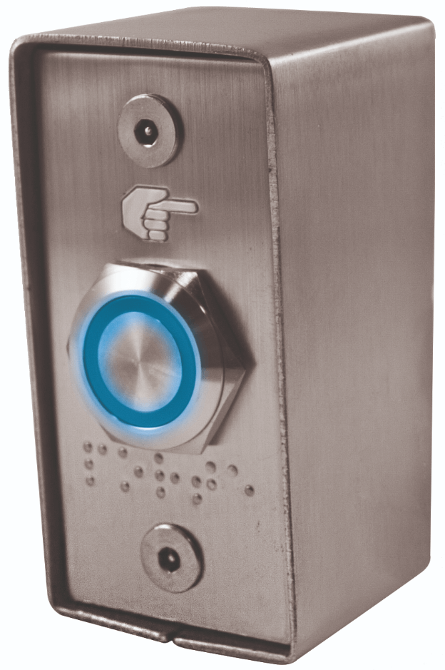 Bouton poussoir à pression lumineux en inox, positionnable en applique. Normes PMR (Personnes à Mobilité Réduite).